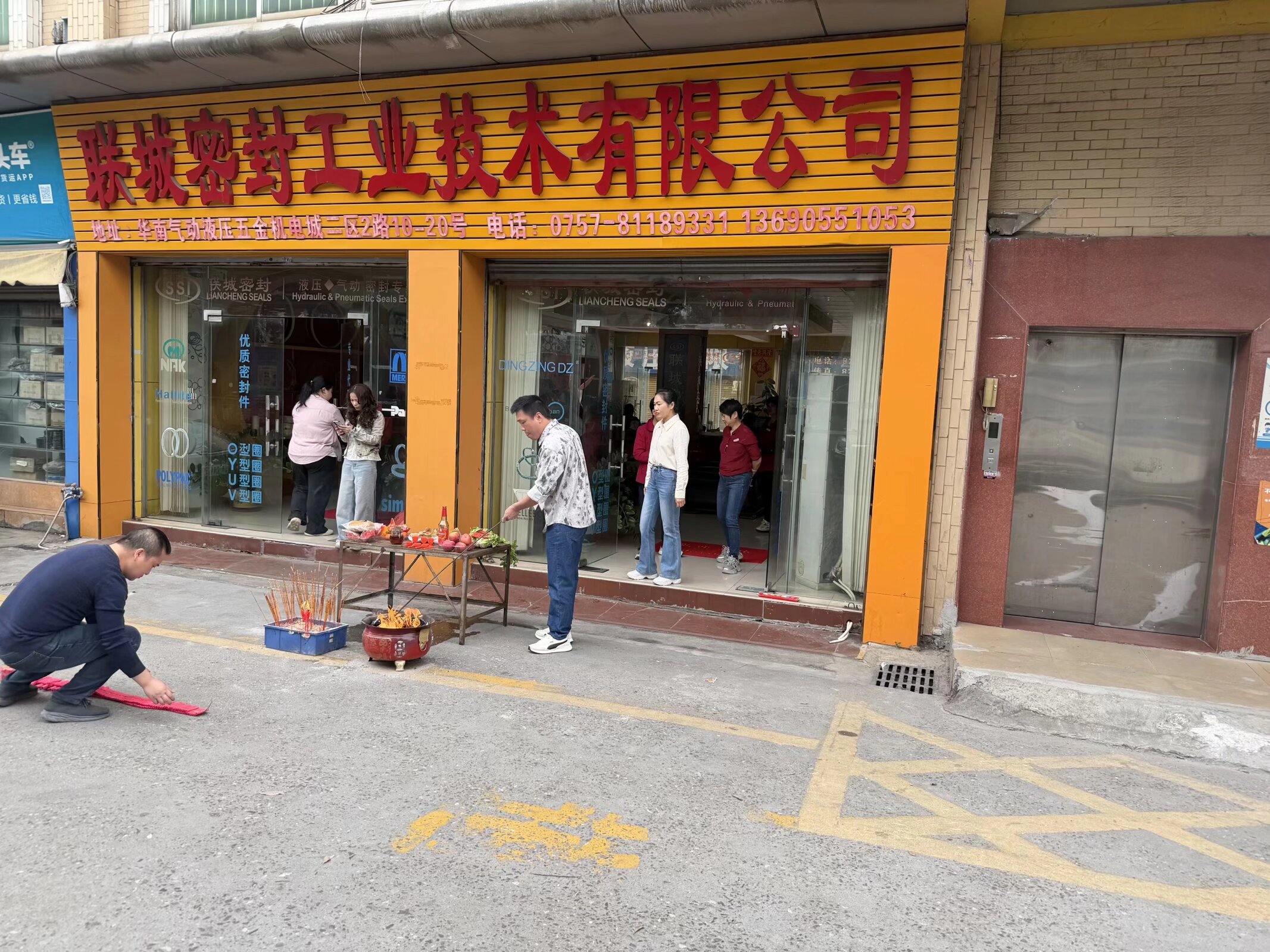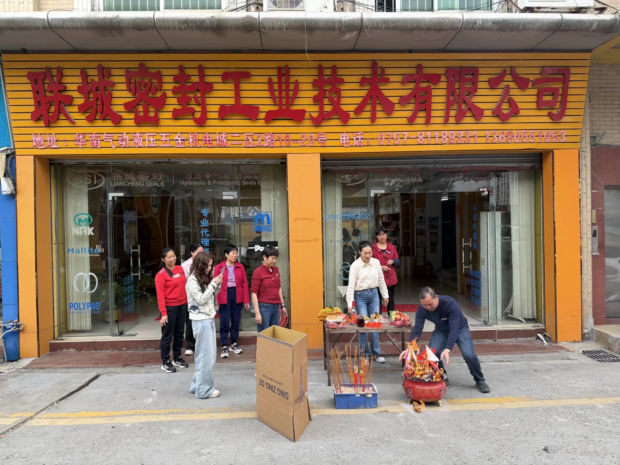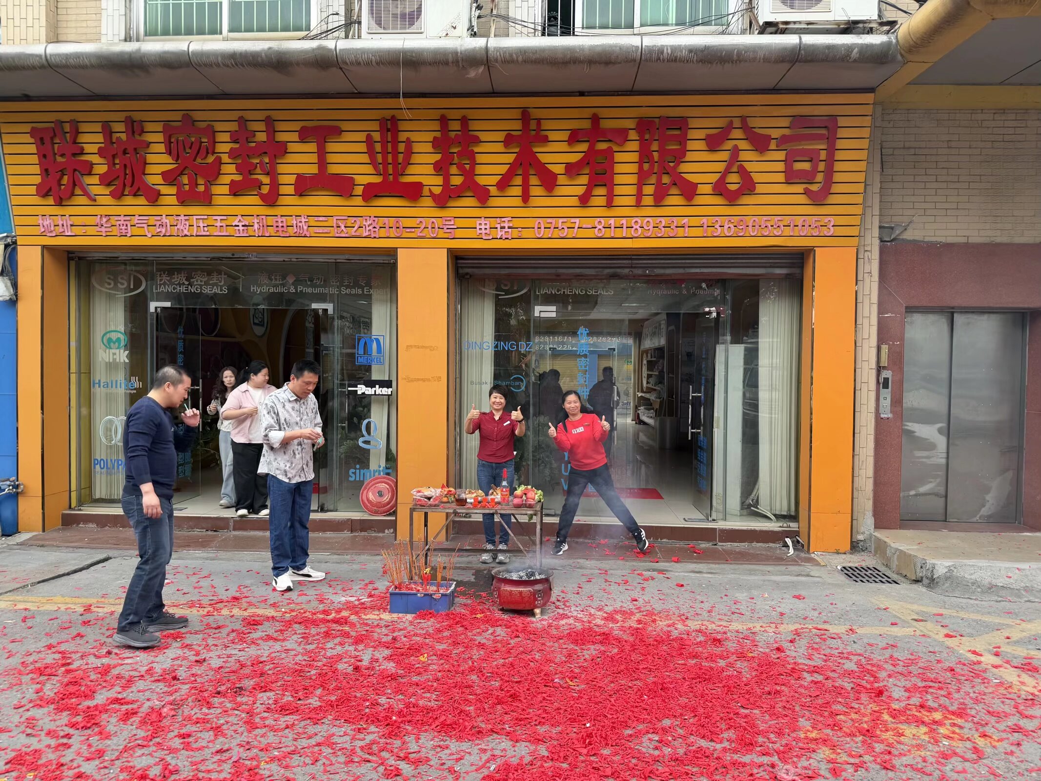2026年2月25日,联城密封工业技术有限公司在位于华南气动液压五金机电城二区的门店前,隆重举行了新年开工仪式。现场红黄交织,气氛喜庆热烈,公司全体员工共同参与了这一传统而富有意义的开工祈福活动。