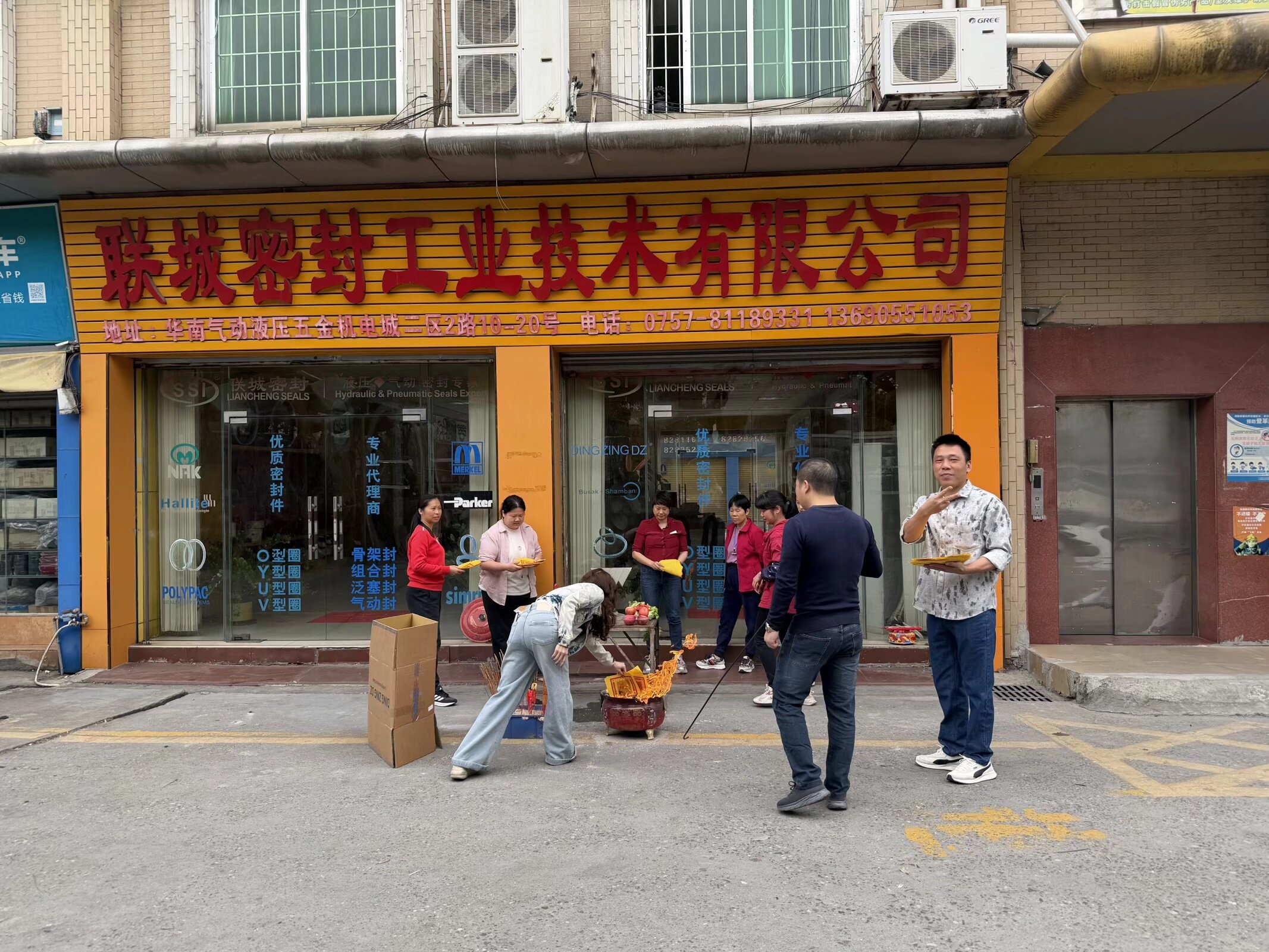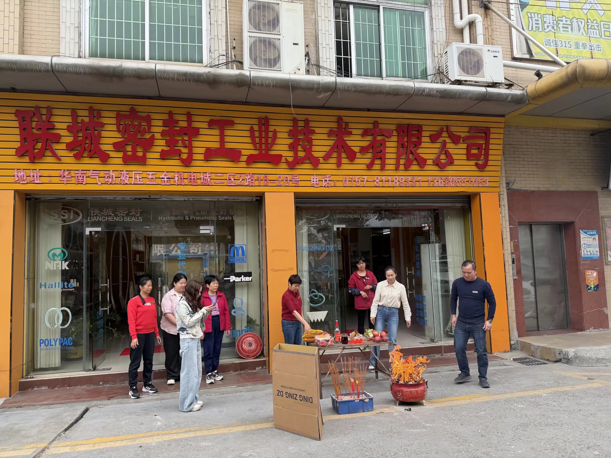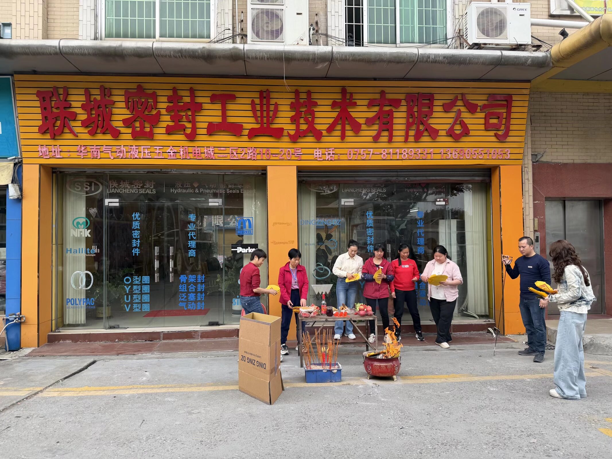 2026年2月25日,联城密封工业技术有限公司在位于华南气动液压五金机电城二区的门店前,隆重举行了新年开工仪式。现场红黄交织,气氛喜庆热烈,公司全体员工共同参与了这一传统而富有意义的开工祈福活动。